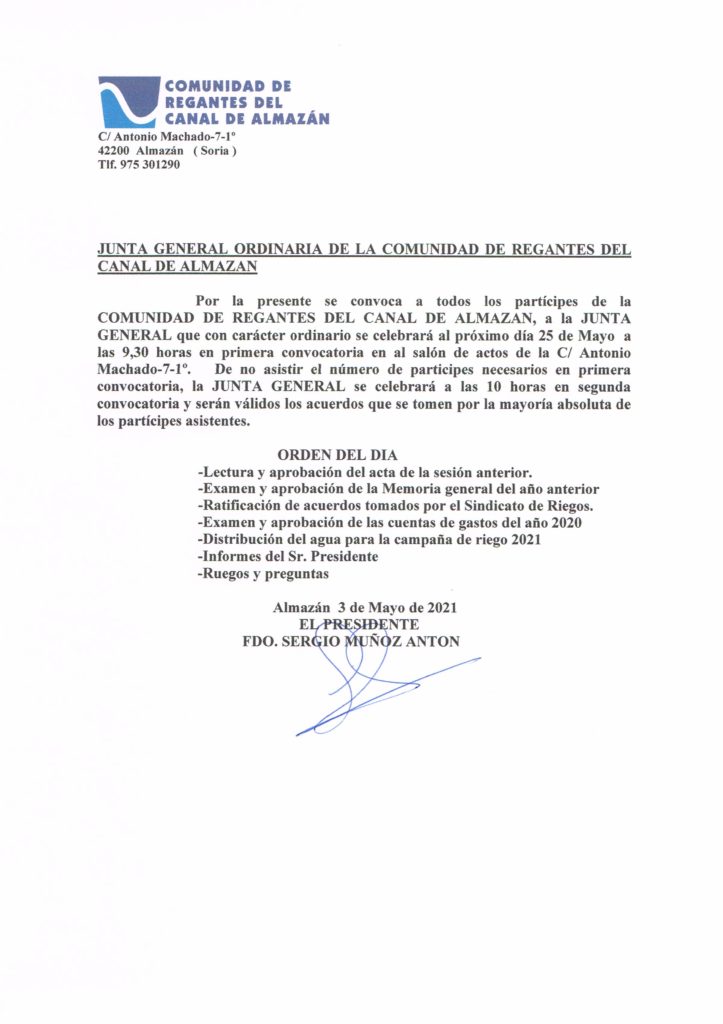Por la presente se pone en conocimiento de todos los partícipes de la Comunidad de Regantes del Canal de Almazán, la convocatoria a la Junta General Ordinaria que se celebrará el día 25 de mayo de 2021 a las 09:30H.
